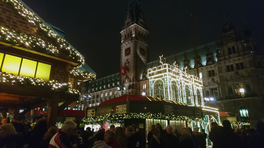 Auf dem vielseitigen Roncalli Weihnachtsmarkt vor dem Hamburger Rathaus