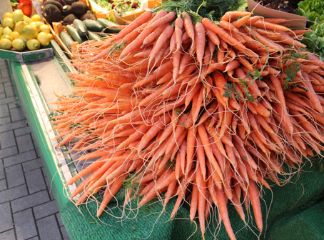 Zum Motiv: Soeben hat Hannelore G. auf dem Wochenmarkt frische Karotten mit Grün, Gurken und Zitronen gekauft.