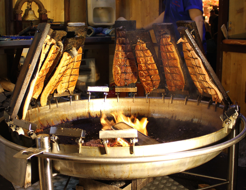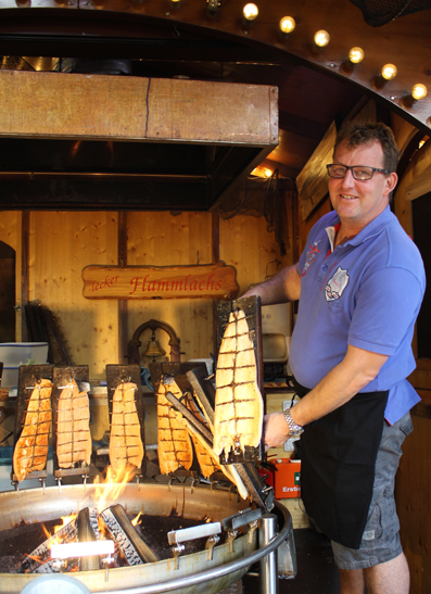Den Flammlachs offeriert er ausschließlich auf Veranstaltungen - wie zum Beispiel dem "Hamburger Fischmarkt auf Reisen", der in diesem Jahr schon in Aschaffenburg und München gastierte - denn der Lachs benötigt 45 Minuten Garzeit. "Das muss exakt geplant werden, sonst stehen sich die Kunden die Beine in den Bauch!"